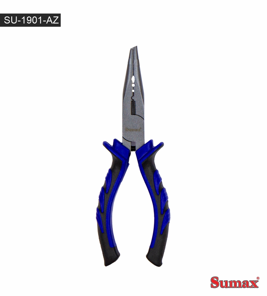 Alicate Sumax SU-1901 de acero al carbono templado y forjado con tratamiento resistente a la corrosión, tiene un diseño de multifunción, boquilla dentada con punta de extracción de anillo dividido, herramienta de corte y herramienta para amasar pesos y plomos.